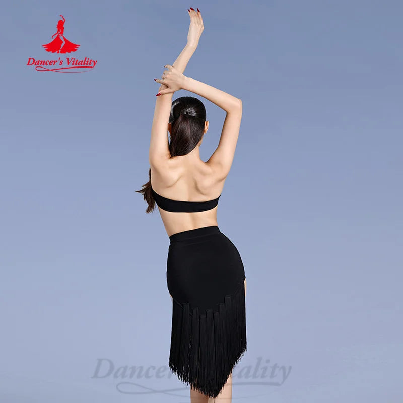 This dynamic Latin dance dress features a black and animal print design with a fringe halter top, offering a sleeveless cut and asymmetrical hem that enhances movement for dances like rumba, cha cha, and samba. Made from a durable polyester blend, it ensures both comfort and stretch, ideal for vibrant dance performances, with easy care for repeated wear.