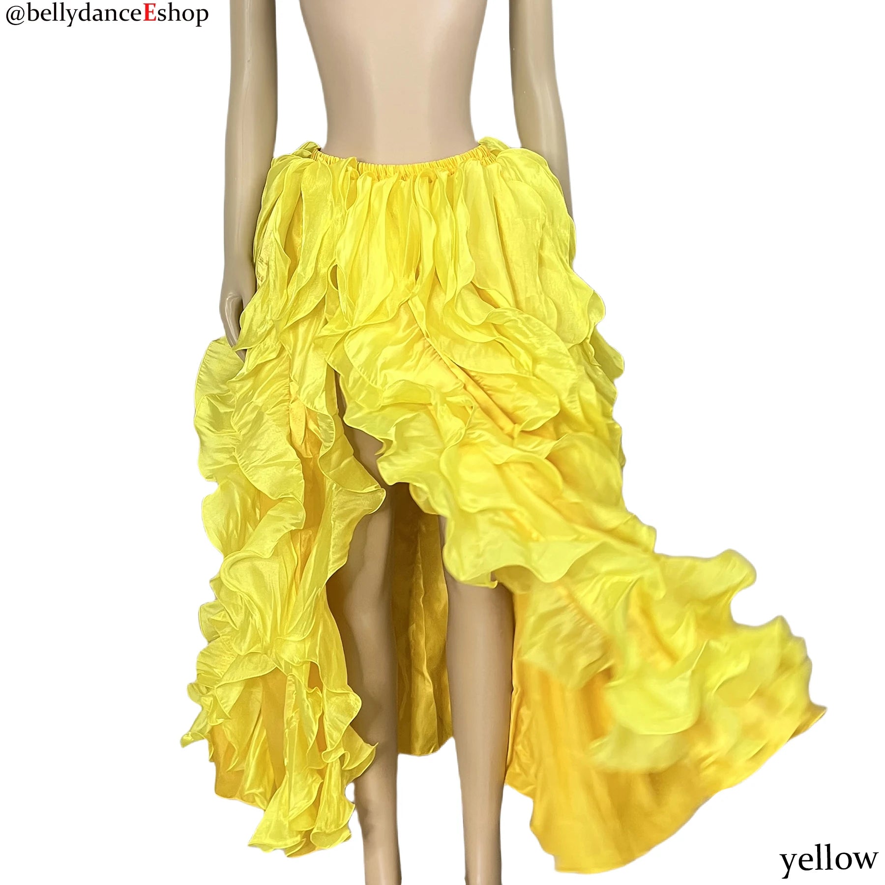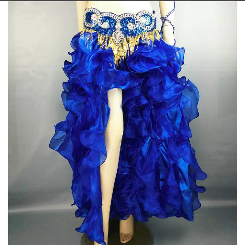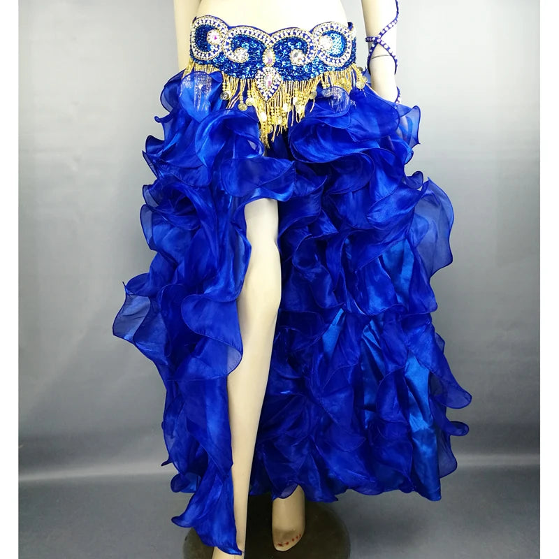 This orange belly dance skirt features intricate bead and sequin detailing, adding flair to any tribal fusion performance. Made from organza, it has a ruffled design and a slit for ease of movement, fitting waist sizes 32"-36", perfect for vibrant dance routines.